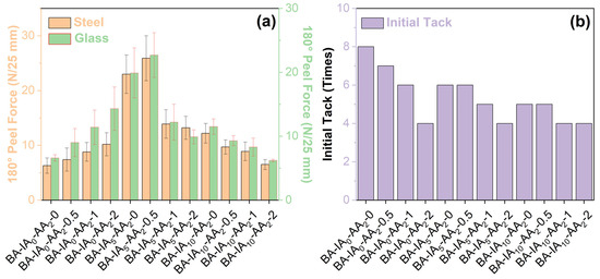 The 180° peel force (a) and initial tack numbers (b) of PSAs.