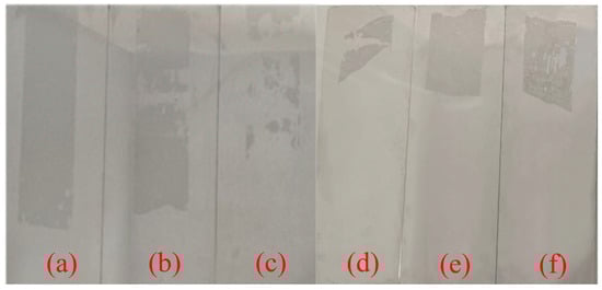 To conduct a detailed analysis of the peel strength of PSA, this study employed stainless-steel and glass plates as test substrates to perform 180° peel force tests on PSA. The results in Table 4 and Figure 8 demonstrate that with an increase in the crosslinker content of the unmodified prepolymer (without IA), the peel force of PSAs gradually increases on both stainless steel and glass. Six of these samples exhibit cohesion failure after peeling (Figure 9) because the absence of the rigid unit IA leads to insufficient interatomic forces [35], which compromises the adhesion in the adhesive material.