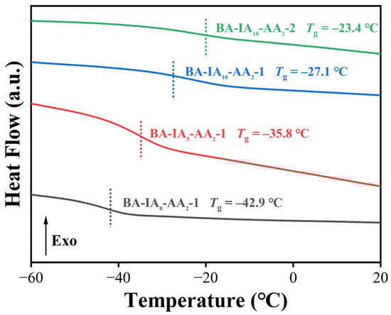 Tg is a critical factor in assessing the suitability of a polymer system for PSA application; an appropriate Tg tends to enhance the pressure-sensitive properties, particularly the peel strength. The Tg of PSA depends on its composition. DSC is a useful tool to determine the Tg of polymeric materials [50,51,52]. Figure 10 shows the DSC curves of BA-IA0-AA2-1, BA-IA5-AA2-1, BA-IA10-AA2-1, and BA-IA10-AA2-2. BA-IA0-AA2-1 exhibits a Tg of −42.9 °C, primarily due to the presence of long “soft segments” within the polymer chains. In contrast, the rigid structure of IA with two furan units tends to increase Tg. With the addition of 5% IA, the Tg of PSA (BA-IA5-AA2-1) increases to −35.8 °C. At an IA content of 10%, as the crosslinker concentration increases from 1 to 2% (BA-IA10-AA2-1 to BA-IA10-AA2-2), the Tg raises from −27.1 to −23.4 °C due to the reduction in free volume and the restriction of molecular chain movement, as well as the decrease in flexibility.