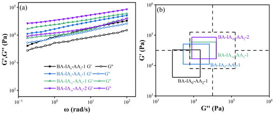 The viscoelastic behavior of PSAs was evaluated through dynamic mechanical or rheological testing. PSAs interact with substrates at low frequencies. According to the “Dahlquist” criterion, PSAs can function when the storage modulus (G′) is less than 3.3 × 105 Pa under operating temperature and low-frequency conditions [53]. Additionally, Chang et al. introduced the “viscoelastic window” concept, estimating the practical adhesive properties of various PSAs across different environmental conditions [54]. Based on these approaches, an advanced rheological technique was employed to measure G′ and the loss modulus (G″), which indicates the elastic and viscous characteristics of the material, respectively.