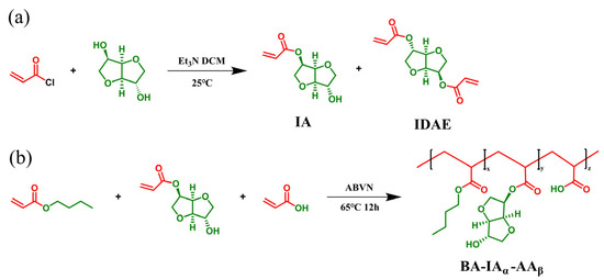 IA and IDAE were synthesized following established procedures [38], as shown in Scheme 2a. Initially, 30 g (210 mmol) of IA was dissolved in a mixture containing 20 g (200 mmol) of triethylamine, 100 mL of dried THF, and 300 mL of DCM. A solution of acryloyl chloride in 75 mL of DCM was then slowly added to the mixture at 0 °C, followed by stirring at 25 °C for 24 h.