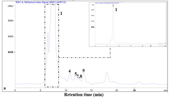 HPLC chromatograms of Rhamnus alaternus stem (a) and leaf (b) polysaccharides recorded at 245 nm. Column: C18 Aminex HPX-87C HPLC column for sugar analysis (250 mm × 4.0 mm). Elution (0.6 mL min−1) was performed using an isocratic gradient of demineralized water for 40 min, which included (1) glucuronic acid, (2) galacturonic acid, (3) sucrose, (4) glucose, (5) galactose, (6) rhamnose, (7) xylose, (8) mannose, and (9) arabinose.