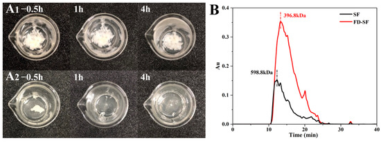 (A) Redissolution of non-autoclaved (A1) and autoclaved (A2) SF lyophilized sponge; (B) molecular weight of freeze-dried SF (FD-SF) and regenerated SF (SF) determined by GPC.