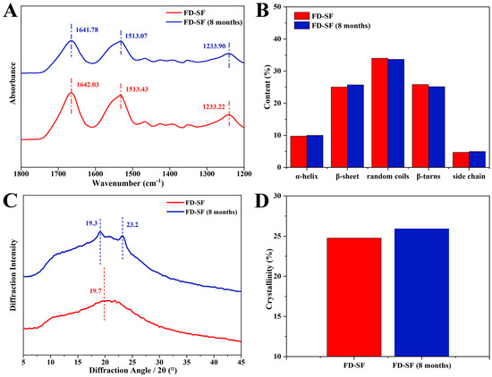Structure analysis of FD-SF before and after 8 months of storage: (A) FTIR spectrum; (B) secondary structure content of FD-SF; (C) X-ray diffraction curve; (D) crystallinity of FD-SF.