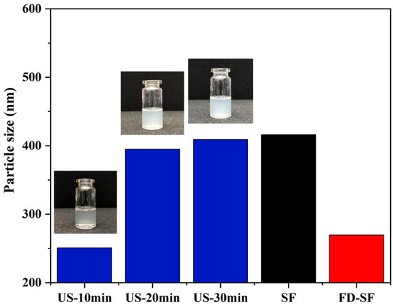 An amount of 5 mL of the FD-SF solutions (8 wt%) was sonicated with the power of 100 W for 10, 20, and 30 min using a cell ultrasonic pulverizer (Scientz-IID, Xinzhi, Ningbo, China) equipped with a 6 mm diameter microtip. The solutions were kept at 4 °C during sonication. The particle size distribution of the SF, FD-SF, and ultrasonicated silk fibroin (US-SF) solutions was measured using a dynamic light scattering spectrophotometer (Micro-Nano Winner 802, Winner, Jinan, China).