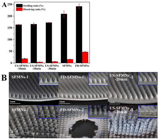 The FD-SF solution was ultrasonicated for 10, 20, and 30 min and then prepared into MNs labelled as US-SFMNs-10 min, US-SFMNs-20 min, and US-SFMNs-30 min. The swelling and dissolving properties of the US-SFMNs were investigated. MNs prepared using the regenerated SF solution (conventional SFMNs) and freeze-dried SF solution (FD-SFMNs) were also examined as controls. The swelling and dissolving ratios of each MN are shown in Figure 6A. Compared to the conventional SFMNs, the swelling ratio of the FD-SFMNs increased by 32%, while the dissolving ratio increased to nearly 50%. The dissolving ratio of the US-SFMNs-10 min was 18.6%, somewhat higher than the conventional SFMNs but much lower than the FD-SFMNs. When the ultrasonic time was prolonged to 20 min, the dissolving ratio remarkably decreased to 4.0%. The results indicate that ultrasonic modification significantly reduced the dissolving ratio of the MNs. Figure 6B shows the morphology of the MNs before and after immersion in PBS. The central part of the FD-SFMNs dissolves in PBS after 5 min of immersion, which may result in a sudden drug release in the FD-SFMNs if loaded [12]. As shown in Figure 6B, the US- SFMNs-20 min had nearly no tip detachment after 24 h of immersion. The reason for the lower swelling and dissolving ratio of the US-SFMNs could be the increase in crystal content caused by ultrasonication, which is consistent with the results from the FTIR and XRD analyses. The ultra-low dissolving ratio of MNs can prevent needle material from remaining in the body, considerably increasing the safety of MN treatments.