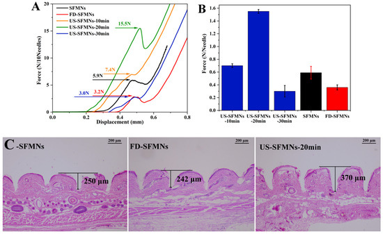 The mechanical strength of the different SFMNs was determined by compression experiments using a texture analyzer. Figure 7A shows the force–displacement curves of different SFMN patches, including the conventional SFMNs, FD-SFMNs, and ultrasonically modified SFMNs (US-SFMNs-10 min, US-SFMNs-20 min, and US-SFMNs-30 min). Each SFMN has a peak in the curve, which is chosen as the fracture force point (labeled in Figure 7A). As shown in Figure 7B, the fracture force per needle of the conventional SFMNs was 0.59 N. For the FD-SFMNs, the fracture force decreased to 0.36 N per needle. The fracture forces of the US-SFMNs-10 min and US-SFMNs-20 min were found to be significantly greater than those of the conventional SFMNs. Notably, the US-SFMNs-20 min showed a fracture force of 1.55 N per needle, which was 2.6 times higher than the conventional SFMNs. However, prolonging the ultrasound duration to 30 min decreased the fracture force to 0.3 N per needle. The lower mechanical strength of the US-SFMNs-30 min compared to the US-SFMNs-20 min may be due to the poor fluidity of the SF solution after prolonged ultrasonication. Although ultrasonication can accelerate the sol–gel transition of SF from an aqueous solution to a β-sheet-rich hydrogel [54,55,56], insufficient fluidity may prevent the SF solution from entering the MN mold during the MN preparation. According to the findings from previous research, the minimum force required for MNs to penetrate through the stratum corneum is 0.045 N per needle [57], implying that the conventional SFMNs and FD-SFMNs can puncture the stratum corneum in theory. However, in practice, the mechanical strength of SFMNs needs to be higher to ensure skin epidermis penetration and lower the possibility of needle breaking [16]. Therefore, the greater mechanical strength of the US-SFMNs-20 min may assure the insertion, while allowing the MNs to penetrate deeper into the skin.