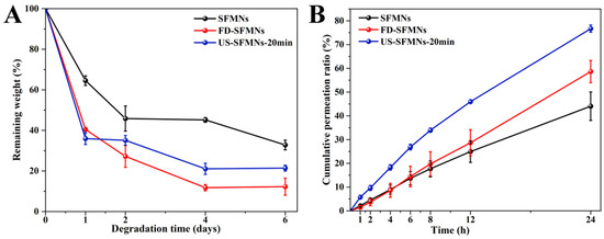 Enzymatic degradation and transdermal permeation of SFMNs in vitro: (A) enzymatic degradation in vitro; (B) transdermal permeation profiles of SFMNs in vitro.