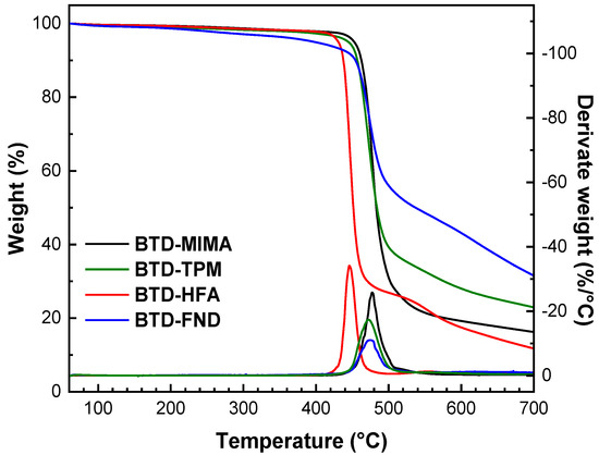 The onset of the decomposition temperature (Td) for the BTD-based polyimides is reported in Table 3, while the TGA thermograms are shown in Figure 2. As noted, the Td for the BTD polyimides was found between 437 and 460 °C under a nitrogen atmosphere. For all BTD polyimides, the TGA thermograms showed only one degradation step, which was attributed to main chain decomposition, except for BTD-HFA, which had a small shoulder at 540 °C. It can be seen that BTD-HFA, which possesses –CF3 groups in its structure, exhibited the lowest thermal stability of the four materials, presenting a Td of 437 °C and the highest weight loss at 700 °C. BTD-HFA also presented the lowest molecular weight of all of the samples, which may have affected its thermal resistance, while BTD-MIMA had the highest Td and it presented the highest molecular weight (see Table 1). By comparing the thermal decomposition temperatures of the synthesized BTD polyimides with similar aromatic polyimides reported by other researchers [2,4,6,14,24,25], the alicyclic polyimides from BTD presented Td values close to those of fully aromatic polyimides but slightly lower due to the aliphatic segment of their alicyclic structure.