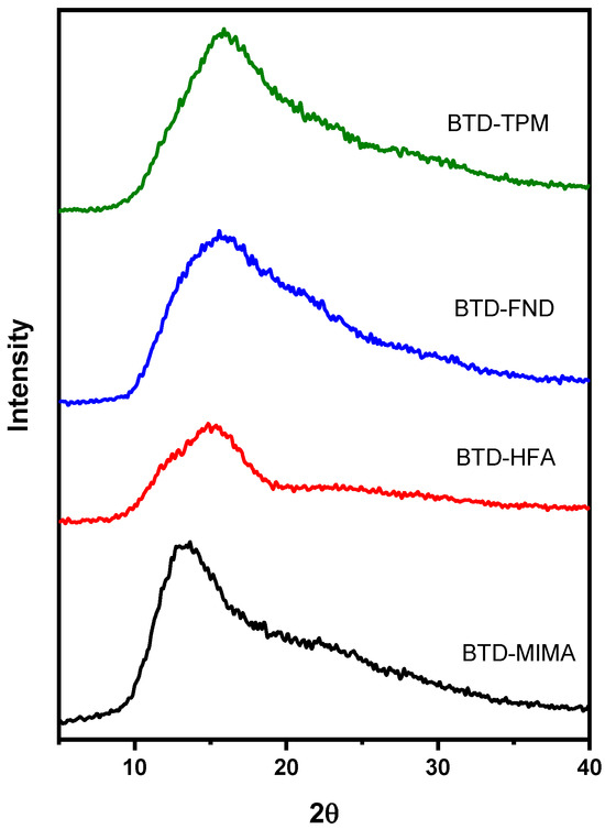 TGA and DSC measurements were used to evaluate the thermal degradation (Td) and glass transition temperature (Tg) of BTD-MIMA, BTD-FND, BTD-TPM, and BTD-HFA, as shown in Table 3. No melting peaks were detected by DSC for the as-synthesized BTD polyimides, only their glass transition, suggesting that all BTD polyimides studied here were amorphous. The amorphous nature of BTD-MIMA, BTD-FND, BTD-TPM, and BTD-HFA was confirmed by X-ray diffraction (DRX) measurements. The glass transition temperatures (Tg) reported for these polyimides were in the range of 272 to 355 °C. However, the experimental Tg of BTD-FND was not possible to determine since, as was previously reported [7], it is >350 °C, which is close to the onset of the decomposition temperature. Among the polyimides characterized, BTD-HFA showed the highest Tg value due to the presence of bulky –CF3 groups, which increased the rotational barriers and inhibited local segmental motions, imparting a higher rigidity to this polyimide [7,23].