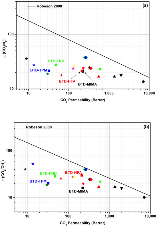 Table 4 shows the ideal selectivity for BTD-based polyimide membranes for the gas pairs CO2/CH4 and CO2/N2. Polyimides BTD-FND and BTD-HFA exhibited the highest selectivity for all gas pairs reported, while highly permeable polyimide BTD-MIMA presented the lowest selectivity, which was consistent with the reported trade-off between permeability and selectivity commonly found for gas separation in polymeric membranes [24]. However, the gas selectivity was better for BTD-HFA than for BTD-MIMA, with little difference in CO2 permeability.