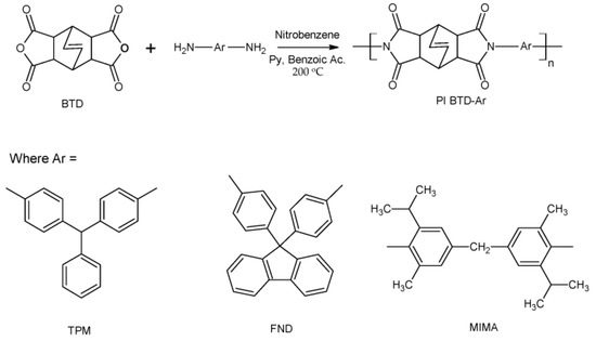 Preparation of the polyimides derived from BTD dianhydride and FND, MIMA, and TMP diamines was performed using a one-step method (see Scheme 1) [14]. In a typical polyimide synthesis, such as BTD-MIMA, a 50 mL three-necked flask equipped with a mechanical stirrer and nitrogen gas flow was charged with 2 mmol of MIMA and 5 mL of nitrobenzene. After the diamine was completely dissolved, 2 mmol of dianhydride BTD in 5 mL of nitrobenzene was added to the stirred solution, and the mixture was heated and kept at 80 °C for 1 h. Then, pyridine (4 mmol) was added and the solution was heated to 120 °C. After that, benzoic acid (4.0 mmol) was added, and the mixture was stirred at 150 °C for 3 h. Finally, the temperature was increased and kept at 200 °C for 24 h. The solution was poured into ethanol, and the obtained product was filtered and washed several times with ethanol. Finally, BTDA-MIMA was dried in a vacuum oven at 200 °C overnight. BTD-TPM and BTD-FND were synthesized according to the same procedure using the appropriate diamines, TMP and FDN.