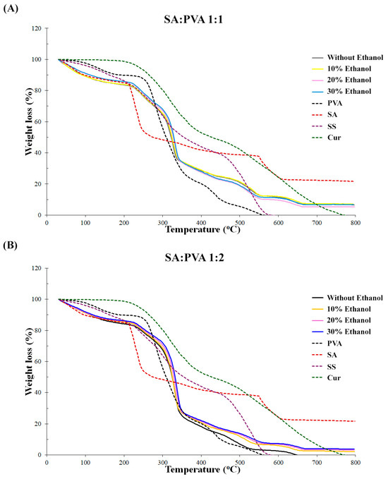 3.4. Thermal Properties of SS–Cur-Loaded SA/PVA Films Crosslinked with Calcium Chloride