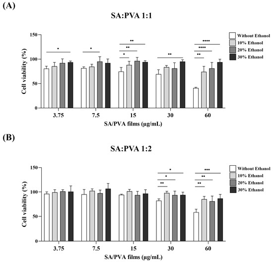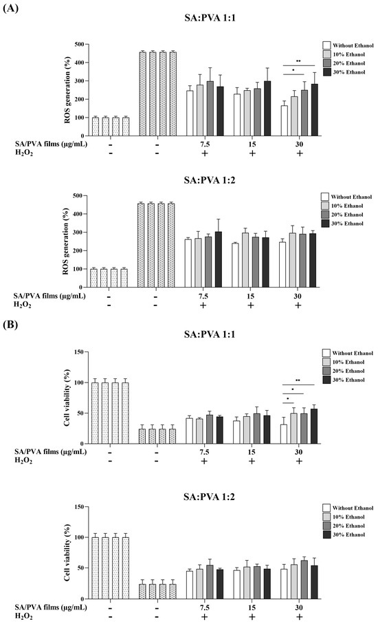3.6. Cytotoxicity Evaluation of SS–Cur-Loaded SA/PVA Films Crosslinked with Calcium Chloride