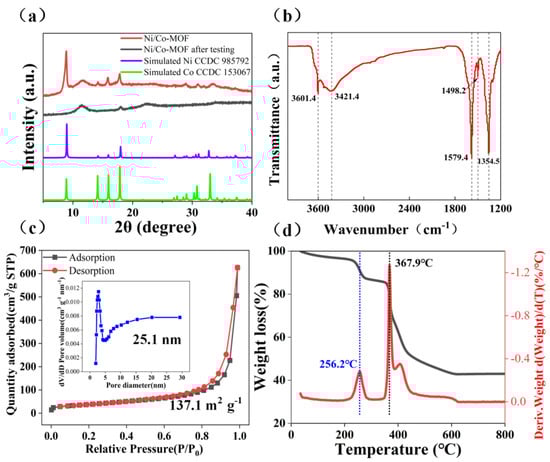 The structural characterizations of Ni/Co-MOF-8 were further performed to analyze in Figure 2. Figure 2a shows strong diffraction peaks at 2θ = 8.2°,14.2°, 15.9°, and 17.9°, which are consistent with the positions of the peaks in the simulated computer diffraction pattern of the standard PDF card information (Simulated Ni CCDC 985,792; Simulated Co CCDC 153,067) [,]. Additionally, XRD analysis was conducted after the electrochemical cycles in Figure 2a (shown as Ni/Co-MOF after testing), showing that some diffraction peaks of Ni/Co-MOF significantly decreased. This was mainly attributable to the uneven sample removed from the test electrode. Figure 2b displays three diffraction peaks at 3601.4 cm−1, 3421.4 cm−1, and 1498.2 cm−1, corresponding to the vibration of -OH, the C=C stretching of coordination water molecules, and the aromatic rings of Ni/Co-MOF-8, respectively. Additionally, the typical diffraction peaks at 1579.4 cm−1 and 1354.5 cm−1 were caused by the vibrations of the coordination group (-COO), which originated from Co-COO-Ni [], further confirming the successful preparation of Ni/Co-MOF.