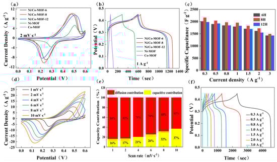 (a) CV curves; (b) GCD curves; (c) gravimetric specific capacitance at different current densities of various electrodes. (d) CV curves; (e) diffusion contribution and capacitance contribution at different scan rates; and (f) GCD curves of Ni/Co-MOF-8.