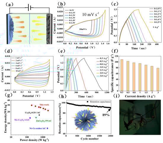The Ni/Co-MOF//AC supercapacitor was fabricated to assess its practicality in Figure 4a. It is well known that achieving high-performance asymmetric supercapacitors requires a crucial balance between the charge of the electrodes, according to Equation (1) []. The operating voltage was adjusted from 1.0 to 1.5 V via CV (Figure 4b) and GCD tests to explore the optimal voltage range of the asymmetric device (Figure 4c). There was no significant polarization phenomenon when the operating voltage reached below 1.4 V. However, visible bubbles appeared on the electrode surface when the operating voltage reached 1.5 V, arising from electrolyte decomposition and then oxygen gas generation, which harms the electrochemical stability of the electrodes. Therefore, the optimum operating voltage of the Ni/Co-MOF//AC device was 0~1.4 V [,].
