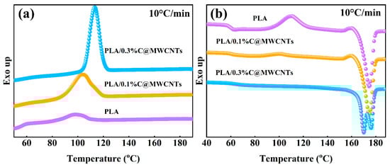 Cooling curve (a) and second heating curve (b) of PLA with different C@MWCNTs contents.