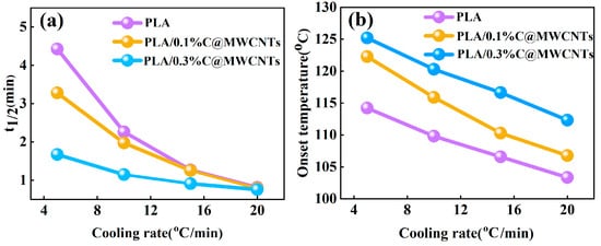 Plots of cooling rate versus (a) t1/2 value and (b) onset temperature for PLA/C@MWCNTs composites.