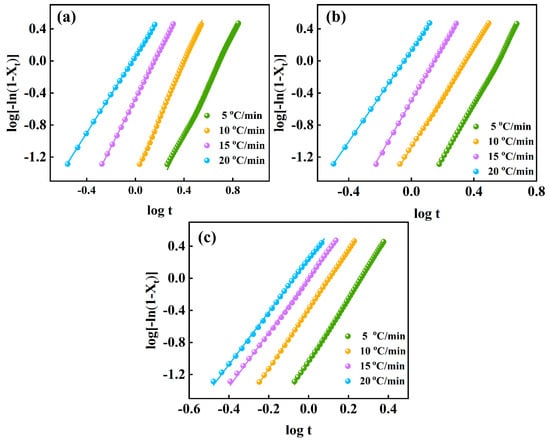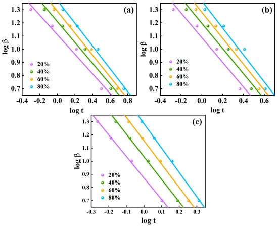 Plots of versus for non-isothermal crystallization of (a) PLA, (b) PLA/0.1%C@MWCNTs, and (c) PLA/0.3%C@MWCNTs composites.