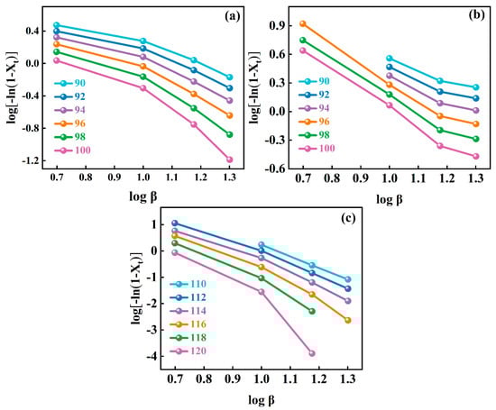 where K(T) denotes the cooling function associated with the crystallization rate, and m represents the Ozawa exponent. To facilitate analysis, plots depicting log[−ln(1 − Xt)] against were generated for the PLA and PLA/0.1%C@MWCNTs composite systems over a temperature range of 90–100 °C. Additionally, the PLA/0.3%C@MWCNTs system was examined within the temperature range of 110–120 °C, as illustrated in Figure 4. Based on Figure 4, it is evident that no straight lines are present, suggesting that the Ozawa model does not effectively describe the non-isothermal crystallization behavior of pure PLA and its composite materials. These results may be attributed to the adaptation of Avrami’s equation in the Ozawa model, which consistently neglects the influences of the secondary crystallization process [31].