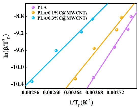 By plotting versus 1/Tp and performing linear fitting, the activation energy of each sample can be obtained from the slope of the fitted curve. Figure 6 shows the fitted curves of versus 1/Tp for the PLA composites. The activation energy values of the PLA, PLA/0.1%C@MWCNTs, and PLA/0.3%C@MWCNTs composites were calculated to be −159.00 kJ/mol, −128.50 kJ/mol, and −103.86 kJ/mol, respectively. Clearly, the PLA/C@MWCNTs composites exhibit higher crystallization activation energy than pure PLA, suggesting that the addition of C@MWCNTs increases the energy barrier for PLA crystallization. This is likely due to the reduced mobility of the PLA molecular chains caused by the incorporation of C@MWCNTs, which hinders their rearrangement. A similar phenomenon was reported by Zhao et al. [40] in their study on the non-isothermal crystallization kinetics of PLA.