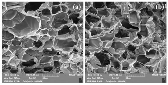 From FE-SEM micrographs (Figure 1), the highly porous structure of the investigated samples, with different sizes of micropores, is obvious. The addition of IA as a comonomer leads to an increase in pore size in comparison with the PNiPAAm homopolymer hydrogel, but some sort of honeycombed morphology is preserved [17]. On the other hand, the incorporation of AgNPs into the polymer network (Figure 1b) has no significant influence on the internal morphology or pore size compared with the neat polymer matrix (Figure 1a), which can be very important for the possible application of such materials.