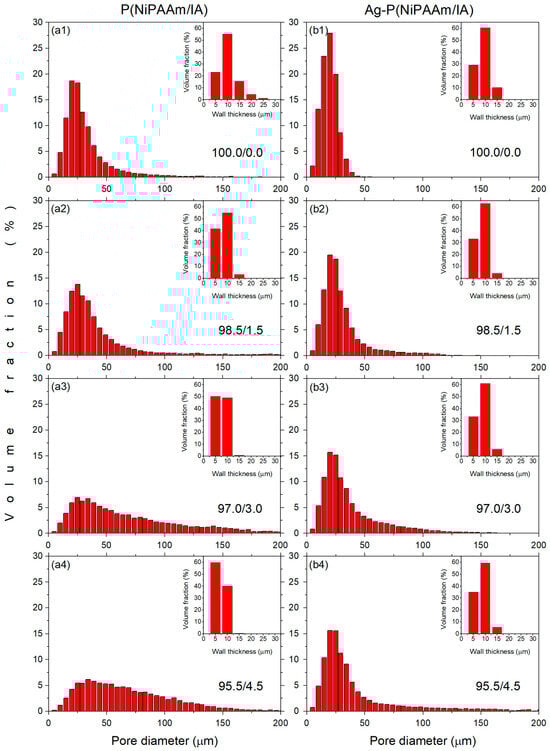 Pore size distribution and wall thickness distribution (insets) for P(NiPAAm/IA) hydrogels (a1–a4) and Ag-P(NiPAAm/IA) hydrogel nanocomposites (b1–b4) obtained by micro-CT analysis.