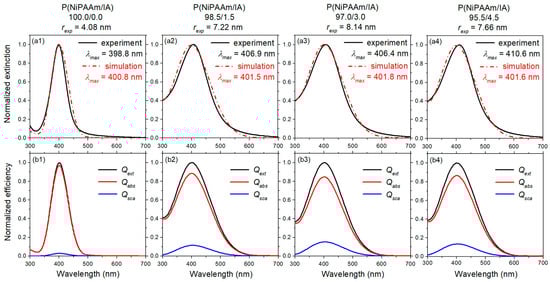 Extinction spectra of Ag-P(NiPAAm/IA) hydrogel nanocomposites: comparison of normalized extinction spectra obtained by experiment and by MiePlot simulation (a1–a4) and normalized efficiency of MiePlot simulated extinction spectra for AgNPs (b1–b4): Qext—extinction efficiency, Qabs—absorption efficiency, Qsca—scattering efficiency.