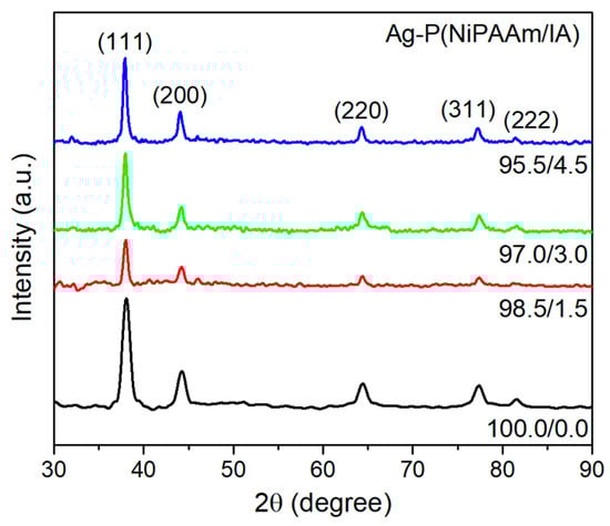 Furthermore, the microstructural analysis of AgNPs incorporated into the crosslinked polymer matrix and the ability of the P(NiPAAm/IA) network to protect and stabilize them from coalescence and growth were examined by XRD measurements. The XRD patterns of the investigated nanocomposites (Figure 5) are consistent with the face-centered cubic (fcc) crystal structure of bulk metallic silver (JCPDS File No.89-3722). The diffraction maxima at the 2θ angle positions of 38.0°, 44.2°, 64.4°, 77.4°, and 81.6° correspond to the Bragg reflections from the crystal planes: (111), (200), (220), (311), and (222). The absence of silver oxide diffraction maxima indicates the existence of pure silver, while the high intensity of the (111) peak indicates a high degree of crystallinity [22,23].