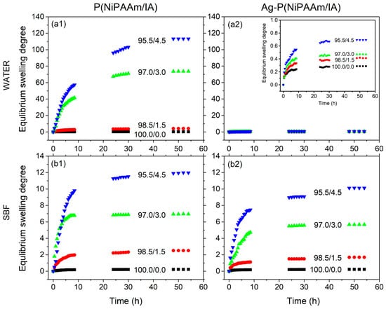 Swelling curves of P(NiPAAm/IA) hydrogels (a1,b1) and Ag-P(NiPAAm/IA) hydrogel nanocomposites (a2,b2) in distilled water (up) and SBF (down) at 37 °C.