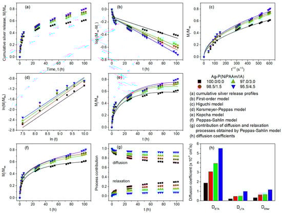 Cumulative silver release profiles (a), mathematical modeling (b–g), and diffusion coefficients (h) for Ag-P(NiPAAm/IA) hydrogel nanocomposites.