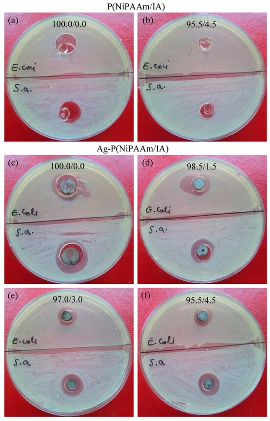 For the disk diffusion method, Petri dishes covered with solidified nutrition agar base (2% agar) were inoculated with E. coli (ATTC 25922) and S. aureus (ATTC 25923) inside the layer of the top agar (0.7% agar). Each bacterial culture (20 mL of 18 h-old bacteria) was added to 15 mL of the top agar solution, put onto the nutrition agar base, and left to solidify. Hydrogel discs (diameter ≈ 8 mm, thickness ≈ 4 mm) of P(NiPAAm/IA) and Ag-P(NiPAAm/IA) were put in the made wells then incubated at 37 °C for 24 h, and the appearance of a clear zone around the disc specimens was monitored.