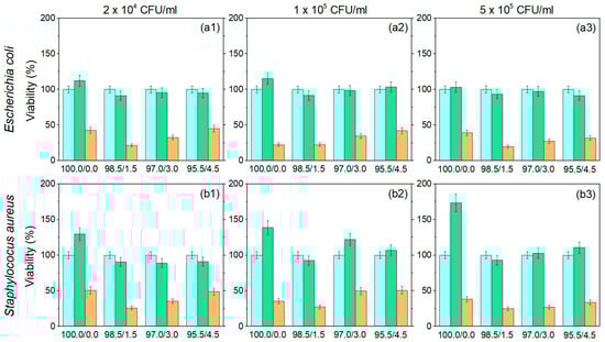 In the optical density method, E. coli and S. aureus were seeded in 24-well plates, each in 1 mL of RPMI-1640 medium consisting of 5% FBS (fetal bovine serum), 1% glutamate, 1% sodium pyruvate, and 4.5 g/L glucose. Three different concentrations of both bacterial cultures (2 × 104, 1 × 105, and 5 × 105 CFU/mL) were seeded and treated with P(NiPAAm/IA) hydrogels and Ag-P(NiPAAm/IA) hydrogel nanocomposites. The untreated bacterial cultures were used as control samples. After 24 h of incubation at 37 °C, the turbidity in each well was determined by TECAN Sunrise reader at 405 nm (OD405). The percentage of surviving bacteria was obtained by comparing OD405 values for treated and nontreated bacteria. All experiments were performed in triplicate and mean values were presented.