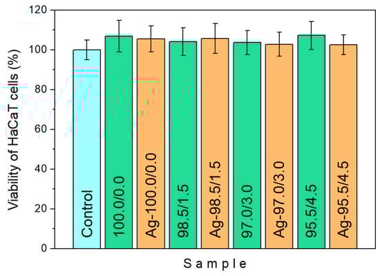 To evaluate the biocompatibility of the investigated systems, the in vitro cytotoxicity of AgNPs was tested on human keratinocytes HaCaT cell line. After defrosting, HaCaT cells were sub-cultivated in an incubator at 37 °C for 7 days, in a humidified atmosphere with 5% CO2. They were cultivated in DMEM (Dulbecco’s Modified Eagle Medium) supplemented with 20 mM HEPES medium (4-(2-hydroxyethyl)-1-piperazineethanesulfonic acid), 10% FBS, 4 g/L glucose, 2 mM L-glutamine, 5000 U/mL penicillin, and 5 mg/mL streptomycin. Then, HaCaT cell lines were seeded in a 24-well plate (25 × 104 cells/well) and, after preparation, were treated with P(NiPAAm/IA) hydrogels and Ag-P(NiPAAm/IA) hydrogel nanocomposites with a silver concentration of around 10 ± 1 ppm. The untreated HaCaT cell line was used as a control. All incubation processes were performed at 37 °C for 24 h. The viability of cultivated HaCaT cells was determined by the well-defined protocol for crystal ciolet assay, measuring the optical density of each well at 570 nm (OD570) with a TECAN Sunrise plate reader. The viability of HaCaT cells was determined by comparing the OD570 values of treated cells with the OD570 values of the nontreated cells [28]. All OD570 measurements of treated cells were done in triplicate and average values were considered.