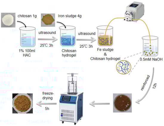The embedding approach was used to create the adsorbent of chitosan/Fe-sludge particles (CHFS). A sufficient amount of iron sludge was essential to achieve optimal adsorption capacity, while an appropriate amount of chitosan ensured adequate mechanical strength and material morphology. After extensive laboratory testing, it was determined that the 1:4 ratio effectively balanced these factors, maximizing adsorption capacity while maintaining the necessary mechanical strength. Thus, a 1:4 ratio of chitosan to iron sludge was selected for granulation. The production process is shown in Figure 1. Firstly, 100 mL of 1% (v/v) acetic acid was mixed with 1 g of chitosan and then placed under ultrasound at room temperature for 3 h to produce the chitosan solution. After adding 4 g of iron sludge to the chitosan solution, the ultrasonic process continued for 3 h to ensure that the iron sludge was equally distributed. Then, the resting chitosan–iron sludge hydrogel was added to a 0.4 M sodium hydroxide solution to create gel beads using a soft tube peristaltic pump. The gel beads were reinforced in sodium hydroxide solution for 12 h to make the final adsorbent, repeatedly cleansed with deionized water, frozen at −55 °C for 12 h, and then dried in a freeze-dryer for 12 h [25].