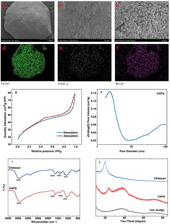 SEM of CHFS (a–c); EDS mapping analysis of CHFS: Fe (d), N (e), and adsorbed Sb (f); N2 adsorption-desorption isotherms of CHFS (g); pore size distribution of CHFS (h); FTIR spectra of CHFS and chitosan (i); XRD pattern of chitosan, CHFS, and iron sludge (j).