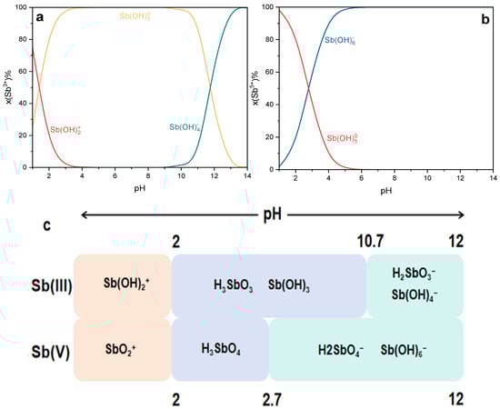 The distribution morphology of Sb(III) and Sb(V) in water at various pH levels was computationally simulated using Visual MINTEQ version 3.1, as illustrated in Figure 3a,b. Previous studies have examined the hydrolysis reactions of antimony in both the Sb(III)-H2O and Sb(V)-H2O systems, with the primary morphological forms detailed in Figure 3c [33,34].