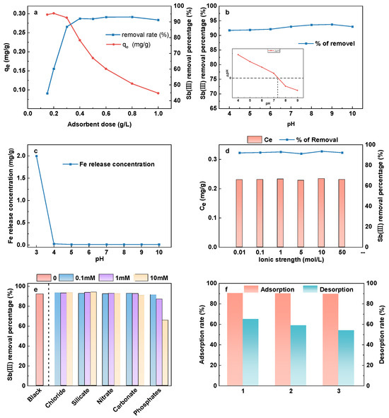 Effect of dosage of CHFS (a); effect of initial solution pH (pH = 4–10), inset: pHpzc determination curve (b); dissolution of iron at different pH (pH = 3–10) (c); impact of ionic strength (d); effect of coexisting anions (e); the adsorption and desorption rate of Sb(III) by CHFS in 3 consecutive cycles (f).