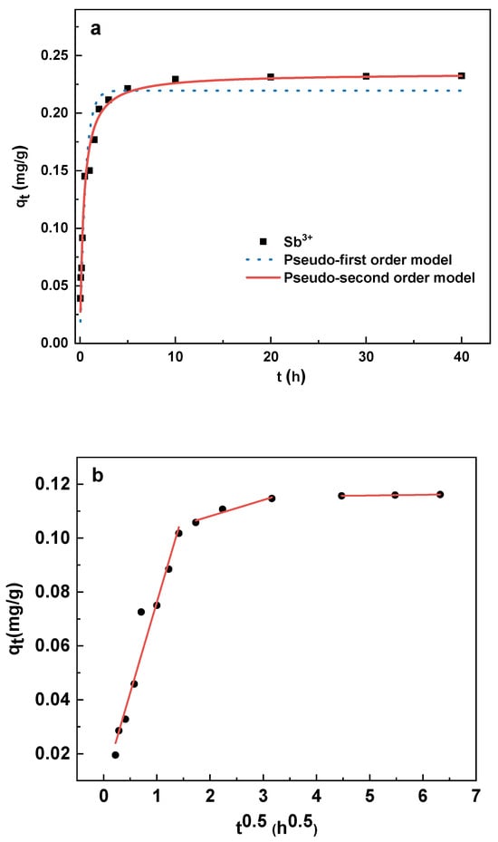 Adsorption kinetics of Sb(III) on CHFS (298.15 K pH 6.6 ± 0.1) (a); intra-particle diffusion model (298.15 K pH 6.6 ± 0.1) (b).