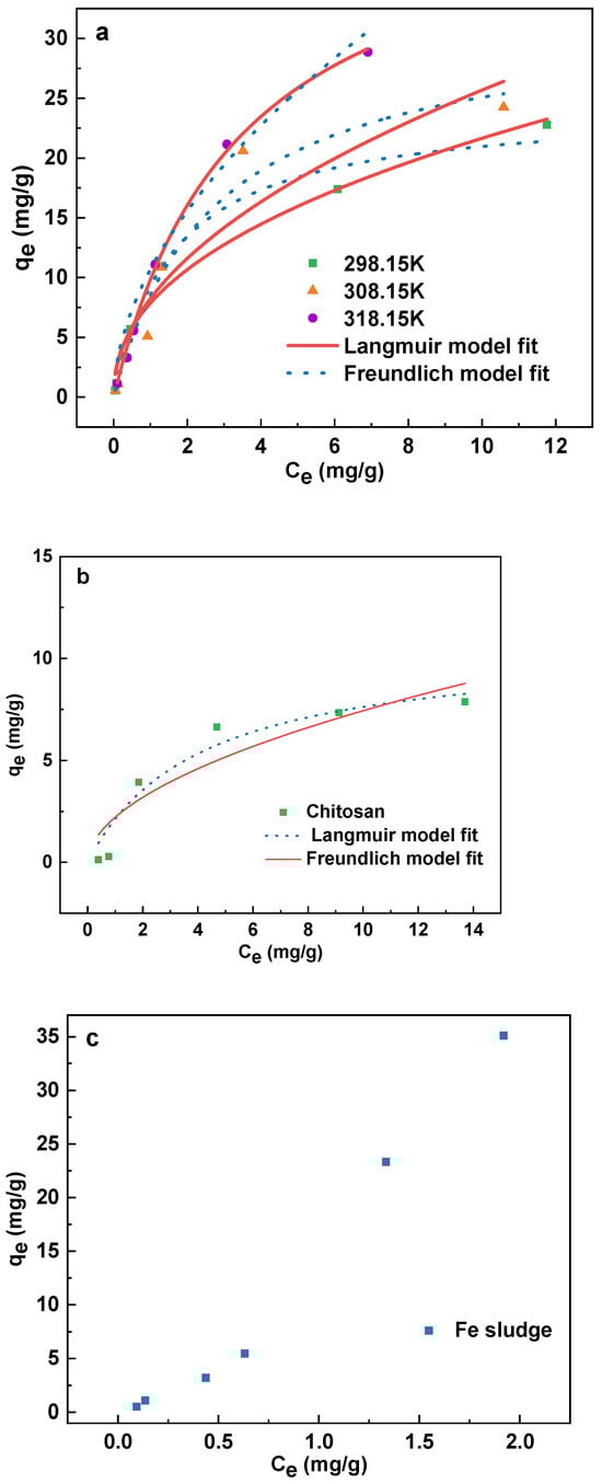 Langmuir and Freundlich isotherm models for Sb(III) adsorption of CHFS (298.15 K, 308.15 K, and 318.15 K at pH 6.6 ± 0.1) (a), chitosan (298.15 K pH 6.6 ± 0.1) (b), adsorption isotherm for Sb(III) adsorption of iron sludge (c), and the Van’t Hoff plots for Sb(III) adsorption of CHFS (d).
