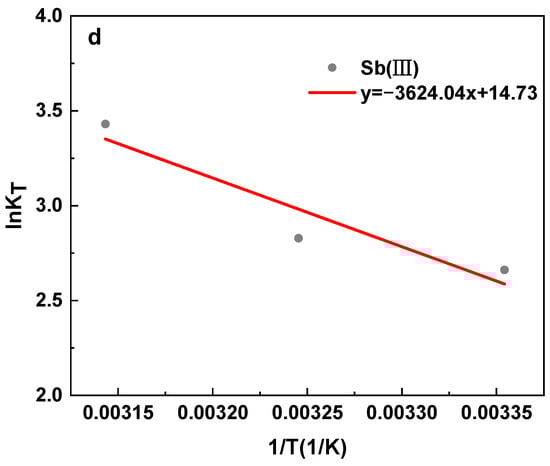 The fitting results reveal that the two fitting lines’ regression coefficients (R2) are more than 0.9, which shows that the two models match the data satisfactorily. The R2 of the Langmuir model is higher than that of the Freundlich model at different temperatures, proving that the adsorption of Sb(III) by CHFS is more suitable with the Langmuir model and that the majority of the adsorption on CHFS is monolayer adsorption. The values of RL at different temperatures were all in the range of 0 to 1, demonstrating that Sb(III) was effectively adsorbable by CHFS. The fitting outcomes of the Freundlich model further support this. Table 2 shows that in the temperature range experiment, 1/n is close to 0.5, indicating that the adsorption of Sb(III) by CHFS is a reasonably easy action. The fitted isothermal experiment findings further support the viability of CHFS for Sb(III) removal.