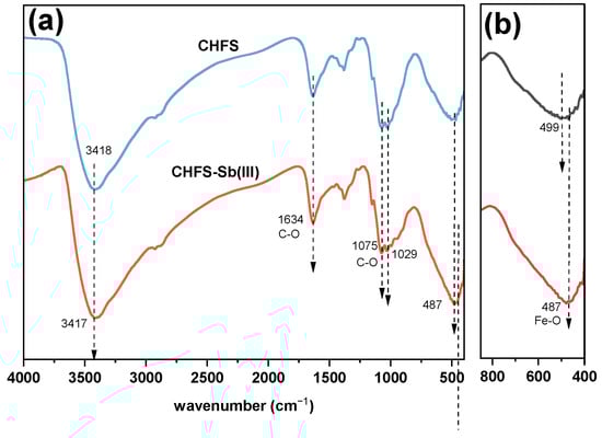 The FTIR plot is shown in Figure 7, before and after CHFS has adsorbed antimony. After adsorption of Sb(III), the iron on the surface of the adsorbent may oxidize and come into contact with air, resulting in a broadening of the peak of the Fe–O group at the peak at 487 cm−1 [57]. In addition, the peak of the Fe–O bond shifted slightly from 499 cm−1 to 487 cm−1, which may be attributed to the formation of the Fe–O–Sb bond. The results suggest that Fe–O bonds are essential in removing antimony [58].