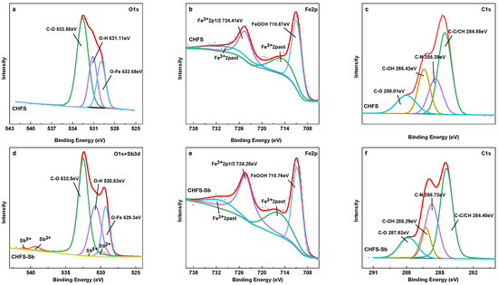 The Fe2p is depicted in Figure 8b,d before and after Sb(III) adsorption by CHFS. The fitting data demonstrate that the iron in CHFS is amorphous FeOOH, compatible with the above XRD findings. After adsorption, the binding energies of Fe2p3/2 and Fe2p1/2 dropped from 710.87 eV and 724.41 eV to 710.70 eV and 724.28 eV, respectively. This might have resulted from the electron transfer that occurs when Fe and Sb form complexes, which lowers the binding energy. Based on the O1s narrow spectrum scan of CHFS (Figure 8a,d), the binding energy of the O–Fe bond reduced from 529.92 eV to 529.30 eV after adsorption, and the integral area ratio decreased from 21.02% to 19.58%. All of them demonstrated that Fe was involved in the process of Sb adsorption to create the Fe–O–Sb inner-sphere complex. Potential chemical processes might result in the inner-sphere complex when Sb(III) and FeOH interact.