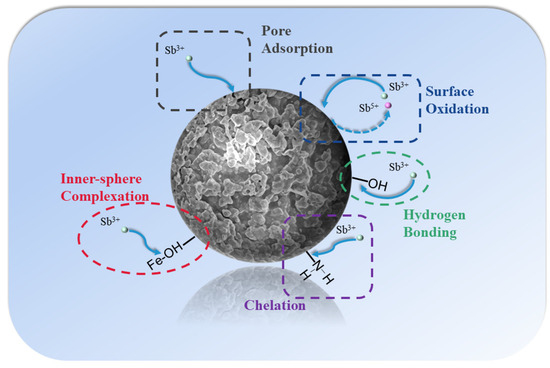 Antimony, a highly toxic metallic element, primarily exists in natural waters in two forms, Sb(III) and Sb(V), with Sb(III) being significantly more toxic than Sb(V) [1]. Antimony concentrations in natural waters are typically kept below 1 mg/L [2]. However, industrial development—mainly using antimony in flame retardants, ceramics, glass, batteries, paints, and textiles—has led to the overexploitation of antimony ores. This has resulted in severe surface and groundwater contamination, with antimony levels rising dramatically to several mg/L and sometimes tens of mg/L [2,3,4,5]. High exposure to antimony poses serious health risks, including damage to the nervous system, liver, kidneys, and lungs, as well as potential genetic abnormalities and cancer [6]. Consequently, removing antimony from water sources, especially the more toxic Sb(III), has become an urgent concern.