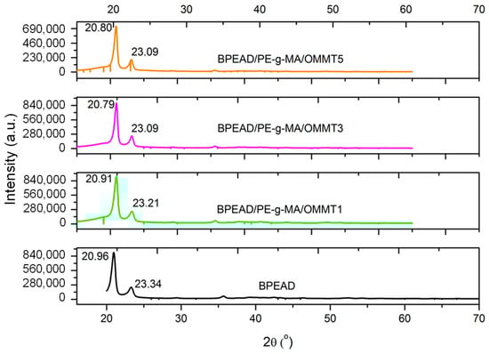 - The mechanical properties under stress indicated that the tensile strength of BPEAD remained essentially unchanged. A biocomposite with 5% by weight of OMMT increased by only 1%. The elongation at break was reduced as a consequence of the compatibilization. The modulus of elasticity B-HDPE was reduced. The impact resistance decreased, and the hardness increased;