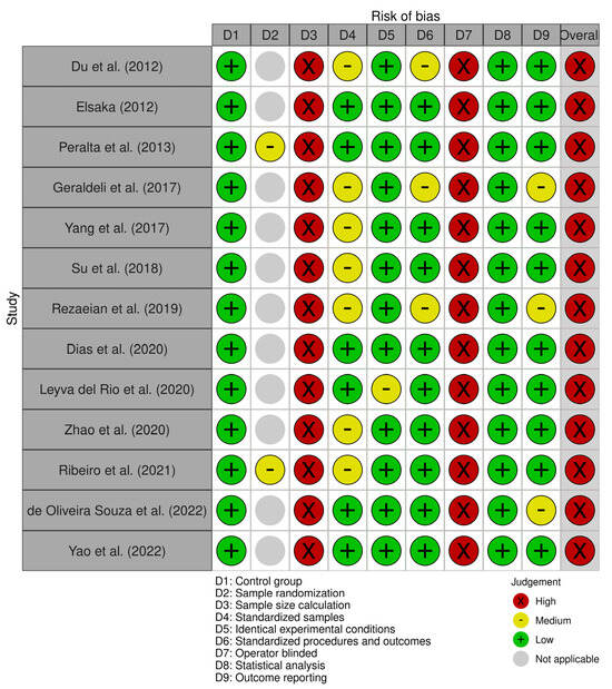 Traffic light plot of the studies’ risk of bias (RoB) analysis [,,,,,,,,,,,,].
