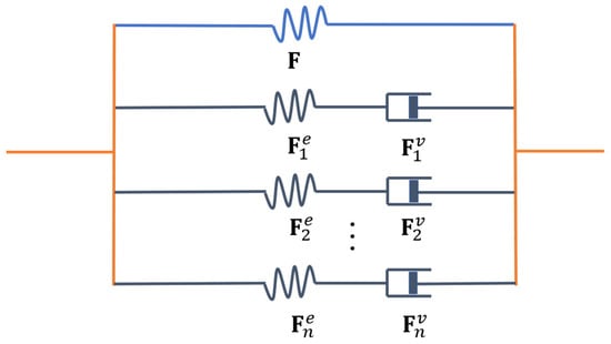 Here, is a function that maps an arbitrary material point inside into a spatial point inside , and represents the gradient operator with respect to the coordinates . To describe the viscoelasticity of solids under large deformation, a generalized Maxwell model [29,30,31,32,33] is employed, as shown in Figure 1. In this model, the solid is represented by an equilibrium spring, characterized by the deformation gradient , along with parallel Maxwell elements (each consisting of a spring and a dashpot in series), characterized by the elastic deformation gradient and the viscous deformation gradient , leading to the following relation: