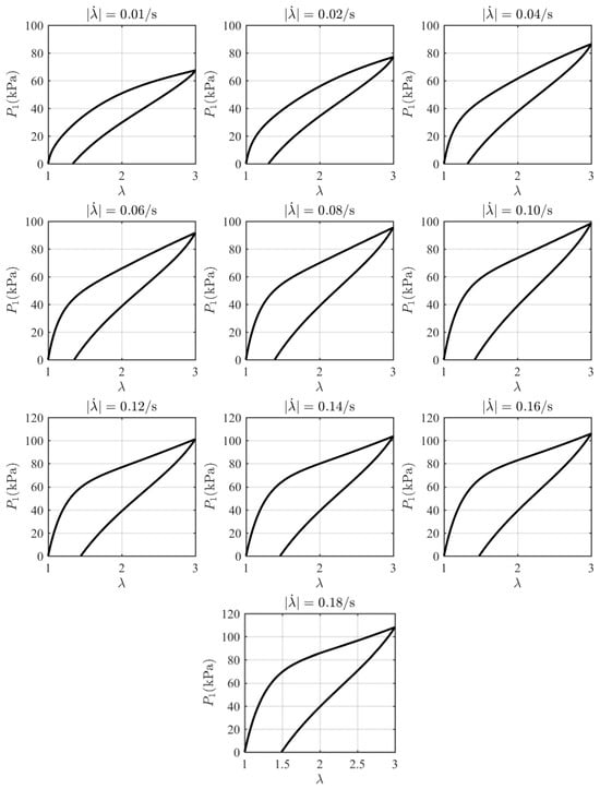 Under the initial conditions , , the coupled Equations (36) and (38) can be solved simultaneously to predict the mechanical behaviors based on the given material parameters. A finite difference approach is used to obtain the numerical results for the evolving stress as a function of the stretch at ten different stretching rates. The model parameters are obtained by fitting Equations (36) and (38) with the experimental data at 296K as n = 3, , , , , , , , . Great consistency between the experimental data and the theoretical model is shown in Figure 2. With these parameters determined, the theoretical data at different stretching rates are calculated as shown in Figure 3. The stress can be observed to increase with stretch during the loading phase and decrease with stretch during the unloading phase. Each loading–unloading cycle exhibits characteristic viscoelastic behavior, with the peak stress magnitude rising as the stretching rate increases.