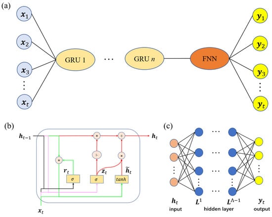 (a) GRU–FNN architecture; (b) details of GRU; (c) details of FNN.